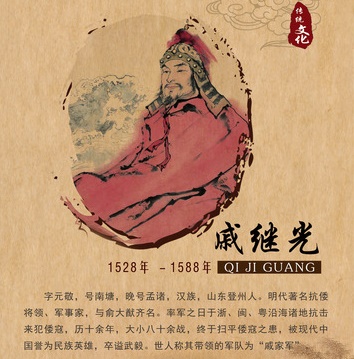 戚继光(1528-1587),字元敬,号南塘,晚号孟诸,山东蓬莱人。出身将门。17岁继承父业,袭世职登州卫(今山东蓬莱县)指挥佥事;旋署都指挥佥事,备倭山东。后因在浙、闽一带抗倭有功,升任总兵官。他一生南征北战、颇有建树,为明代抗倭名将、著名军事家。著有《纪效新书》、《练兵实纪》、《莅戍要略》、《止止堂集》。