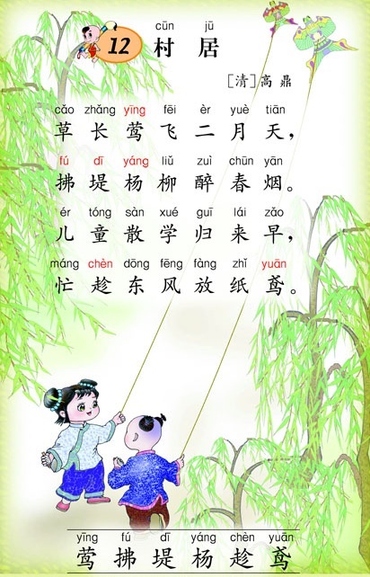 农历二月,村子前后的青草已经渐渐发芽生长,黄莺飞来飞去。杨柳披着长长的绿枝条,随风摆动,好像在轻轻地抚摸着堤岸。在水泽和草木间蒸发的水汽,如同烟雾般凝集着。杨柳似乎都陶醉在这浓丽的景色中。村里的孩子们放了学急忙跑回家,趁着东风把风筝放上蓝天。