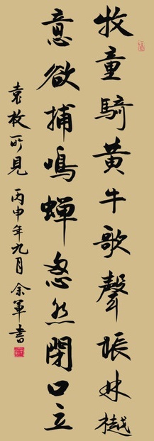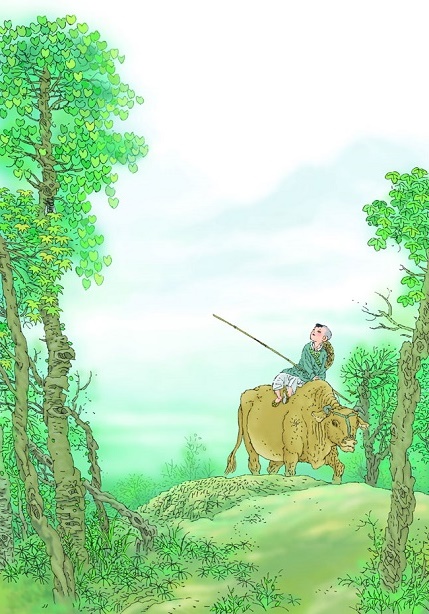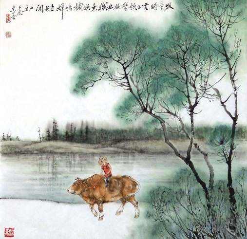 牧童骑在黄牛背上,嘹亮的歌声在林中回荡。忽然想要捕捉树上鸣叫的知了,就马上停止唱歌,一声不响地站立在树旁。