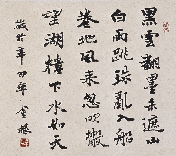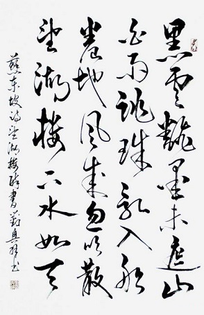 本描绘了望湖楼的美丽雨景。好的诗人善于捕捉自己的灵感,本诗的灵感可谓突现于一个“醉”字上。醉于酒,更醉于山水之美,进而激情澎湃,才赋成即景佳作。才思敏捷的诗人用诗句捕捉到西子湖这一番别具风味的“即兴表演”,绘成一幅“西湖骤雨图”。乌云骤聚,大雨突降,倾刻又雨过天晴,水天一色。又是山,又是水,又是船,这就突出了泛舟西湖的特点。其次,作者用“黑云翻墨”,“白雨跳珠”形成强烈的色彩对比,给人以很强的质感。再次,用“翻墨”写云的来势,用“跳珠”描绘雨点飞溅的情态,以动词前移的句式使比喻运用得灵活生动却不露痕迹。而“卷地风来忽吹散,望湖楼下水如天”两句又把天气由骤雨到晴朗前转变之快描绘得令人心清气爽,眼前陡然一亮,境界大开。