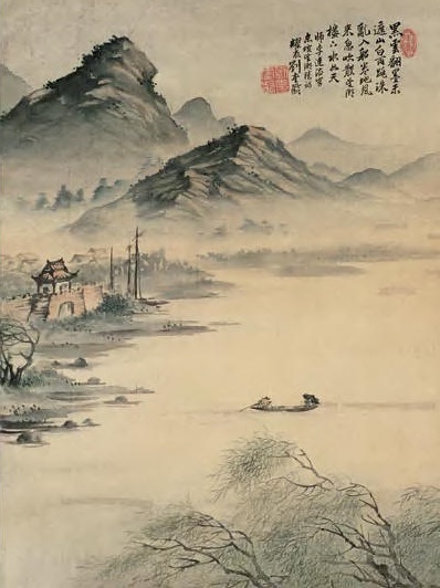 乌云上涌,就如墨汁泼下,却又在天边露出一段山峦,明丽清新,大雨激起的水花如白珠碎石,飞溅入船。