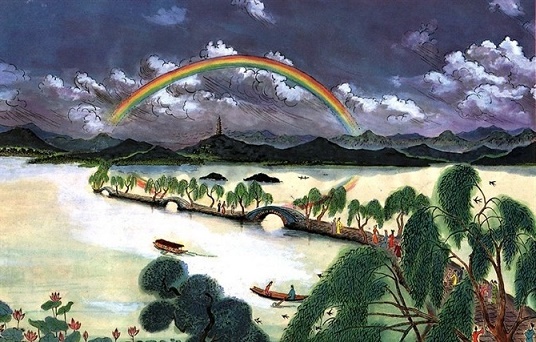 6、白雨:指夏日阵雨的特殊景观,因雨点大而猛,在湖光山色的衬托下,显得白而透明。