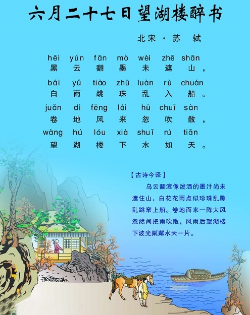 诗人苏轼先在船中,后在楼头,迅速捕捉住湖上急剧变化的自然景物:云翻、雨泻、风卷、天晴,写得有远有近,有动有静,有声有色,有景有情。读起来,你会油然产生一种身临其境的感觉——仿佛自己也在湖心经历了一场突然来去的阵雨,又来到望湖楼头观赏那水天一色的美丽风光。