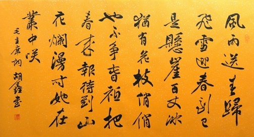 待到山花烂漫时,她在丛中笑。出自中国伟大领袖毛泽东主席读陆游同题词《卜算子·咏梅》,反其意而作。写梅花的美丽、积极、坚贞,不是愁而是笑,不是孤傲而是具有新时代革命者的操守与傲骨。