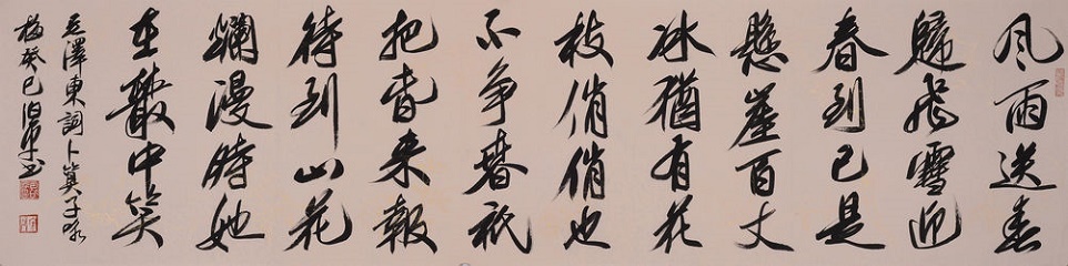 毛泽东这首词前有引语:“读陆游咏梅词,反其意而用之。”表明了创作契机。“风雨送春归,飞雪迎春到。”词的起句就以健笔凌云之势,表现出了与陆游明显的不同的胸襟与气魄。“风雨”、“飞雪”点出了四季的变化,时间的更替,“春归”、“春到”着眼于事物的运动,既给全篇造成了一种时间的流动感,又为下边写雪中之梅作了饱历沧桑的准备,词句挺拔,气势昂扬。