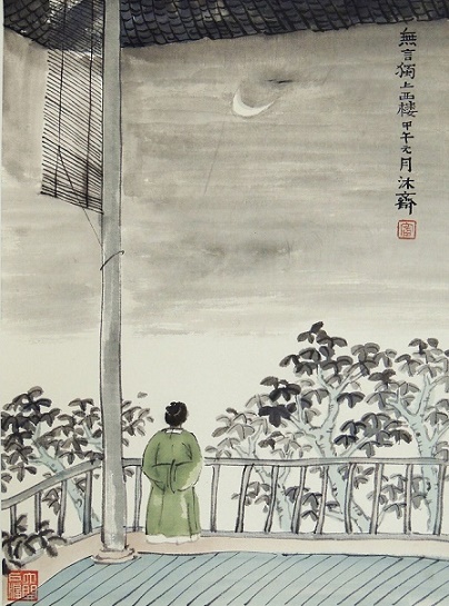 首句“无言独上西楼”将人物引入画面。“无言”二字活画出词人的愁苦神态,“独上”二字勾勒出作者孤身登楼的身影,孤独的词人默默无语,独自登上西楼。神态与动作的描写,揭示了词人内心深处隐寓的很多不能倾诉的孤寂与凄婉。