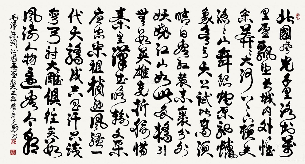 前三句“北国风光,千里冰封,万里雪飘”,总写北国雪景,把读者引入一个冰天雪地、广袤无垠的银色世界。“北国风光”是上片内容的总领句。“千里”“万里”两句是交错说的,即千万里都是冰封,千万里都是雪飘。诗人登高远望,眼界极为广阔,但是“千里”“万里”都远非目力所及,是诗人的视野在想像之中延伸扩展,意境更加开阔,气魄非常宏大。天地茫茫,纯然一色,包容一切。“冰封”凝然安静,“雪飘”舞姿轻盈,静动相衬,静穆之中又有飘舞的动态。