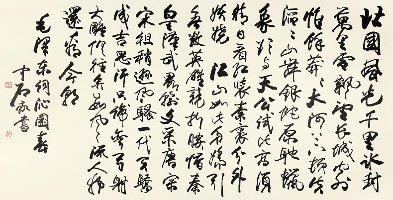 第二十三句至第二十五句”俱往矣,数风流人物,还看今朝“,“俱往矣”三字,言有尽而意无穷,有画龙点睛之妙。将中国封建社会的历史一笔带过,转向诗人所处的当今时代,点出全词“数风流人物,还看今朝”的主题。“今朝”是一个新的时代,新的时代需要新的风流人物来带领。“今朝”的风流人物不负历史的使命,超越于历史上的英雄人物,具有更卓越的才能,并且必将创造空前伟大的业绩,是诗人坚定的自信和伟大的抱负。这震撼千古的结语,发出了超越历史的宣言,道出了改造世界的壮志。那一刻思接千载,那一刻洞悉未来,那一刻豪情万丈,那一刻傲视古今。