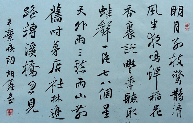 辛弃疾的这首词前两句“明月别枝惊鹊,清风半夜鸣蝉”表面看来,写的是风、月、蝉、鹊这些极其平常的景物,然而经过作者巧妙的组合,结果平常中就显得不平常了。鹊儿的惊飞不定,不是盘旋在一般树头,而是飞绕在横斜突兀的枝干之上。因为月光明亮,所以鹊儿被惊醒了;而鹊儿惊飞,自然也就会引起“别枝”摇曳。同时,知了的鸣叫声也是有其一定时间的。夜间的鸣叫声不同于烈日炎炎下的嘶鸣,而当凉风徐徐吹拂时,往往特别感到清幽。总之,“惊鹊”和“鸣蝉”两句动中寓静,把半夜“清风”“明月”下的景色描绘得令人悠然神往。