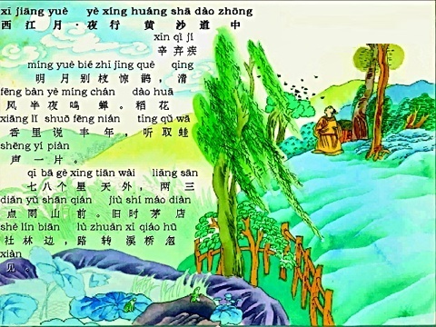 天边的明月升上了树梢,惊飞了栖息在枝头的喜鹊。清凉的晚风仿佛吹来了远处的蝉叫声。在稻谷的香气里,人们谈论着丰收的年景,耳边传来一阵阵青蛙的叫声,好像在说着丰收年。