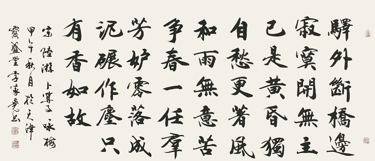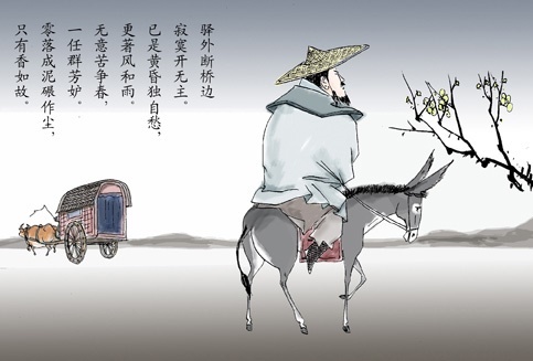 驿站外断桥旁。梅花寂寞地开放、孤孤单单.无人来欣赏。黄昏里独处已够愁苦.又遭到风吹雨打而飘落四方。它花开在百花之首.却无心同百花争享春光,只任凭百花去总妒。即使花片飘落被碾作尘泥,也依然有永久的芬芳留在人间。