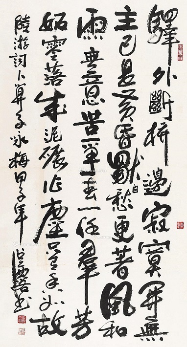 词的上半阕着力渲染梅的落寞凄清、饱受风雨之苦的情形。陆游曾经称赞梅花“雪虐风饕愈凛然,花中气节最高坚”(《落梅》)。梅花如此清幽绝俗,出于众花之上,可是“如今”竟开在郊野的驿站外面,紧临着破败不堪的“断桥”,自然是人迹罕至、寂寥荒寒、倍受冷落、令人怜惜了。无人照看与护理,其生死荣枯全凭自己。“断桥”已失去沟通两岸的功能,唯有断烂木石,更是人迹罕至之处。由于这些原因,它只能“寂寞开无主”了,“无主”既指无人照管,又指梅花无人赏识,不得与人亲近交流而只能孤芳自赏,独自走完自己的生命历程而已。“已是黄昏独自愁”是拟人手法,写梅花的精神状态,身处荒僻之境的野梅,虽无人栽培,无人关心,但它凭借自己顽强的生命力也终于长成开花了。宝剑剑锋从磨砺出,梅花香自苦寒来!野梅不平凡的遭遇使它具有不同凡响的气质。范成大《梅谱序》说:“野生不经栽接者,……谓之野梅,……香最清。”可是,由于地势使然,野梅虽历经磨难而独具清芬,却无人能会,无人领略其神韵。这犹如“幽居见。那么,野梅为何又偏在黄昏时分独自愁呢?因为白天,它尚残存着一线被人发现的幻想,而一到黄昏,这些微的幻想也彻底破灭了;这也如前人闺怨诗所说:最难消遣是黄昏!不仅如此,黄昏又是阴阳交替,气温转冷而易生风雨的时辰,所以;除了心灵的痛苦之外,还要有肢体上的折磨,“更著风和雨”。这内外交困、身心俱损的情形将梅花之不幸推到了极处,野梅的遭遇也是作者已往人生的写照,倾注了诗人的心血! “寂寞开无主”一句,作者将自己的感情倾注在客观景物之中,首句是景语,这句已是情语了。