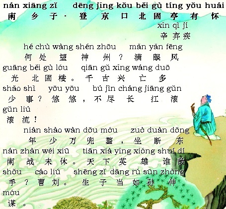 辛弃疾在公元1203年(宋宁宗嘉泰三年)六月末被起用为绍兴知府兼浙东安抚使后不久,即第二年阳春三月,改派到镇江去做知府。镇江,在历史上曾是英雄用武和建功立业之地,此时成了与金人对垒的第二道防线。每当他登临京口(即镇江)北固亭时,触景生情,不胜感慨系之。这首词就是在这一背景下写成的。