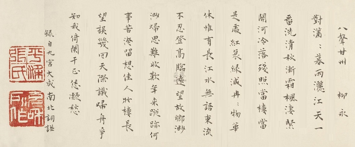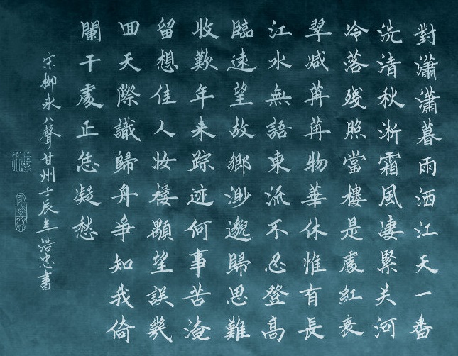 八声甘州,是词牌名。全词共八韵,所以叫“八声”。词分上下两曲,上曲写景,下曲抒情,脉络十分清晰。《八声甘州》简称《甘州》,又名《潇潇雨》、《宴瑶池》。唐边塞曲。据王灼《碧鸡漫志》卷三:“《甘州》世不见,今‘仙吕调’有曲破,有八声慢,有令,而‘中吕调’有《象八声甘州》,他宫调不见也。凡大曲就本宫调制引、序、慢、近、令,盖度曲者常态。若《象八声甘州》,即是用其法于‘中吕调’。”今所传《八声甘州》,《乐章集》入“仙吕调”。因全词共八韵,故称“八声”。九十七字,前后片各四平韵。亦有首句増一韵者。