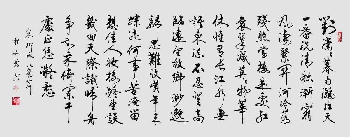 词的上片写作者登高临远,景物描写中融注着悲凉之感。一开头,总写秋景,雨后江天,澄澈如洗。头两句“对潇潇暮雨洒江天,一番洗清秋。”用“对”字作领字,勾画出词人正面对着一幅暮秋傍晚的秋江雨景。“洗”字生动真切,潜透出一种情心。“潇”和“洒”字,用来形容暮雨,仿佛使人听到了雨声,看到了雨的动态。接着写高处景象,连用三个排句:“渐霜风凄惨,关何冷落,残照妆楼。”进一步烘托凄凉、萧索的气氛,连一向鄙视柳词的苏轼也赞叹“此语于诗句不减唐人高处”(赵令畴《侯鲭录》)。所谓“不减唐人高处”,主要是指景中有情,情景交融,悲壮阔大;凄冷的寒风和着潇潇暮雨紧相吹来,关山江河都冷落了,残日的余辉映照着作者所在的高楼,所写的每一个景色里,都渗透着作者深沉的感情。这三句由“渐”字领起。雨后傍晚的江边,寒风渐冷渐急,身上的感觉如此,眼前看到的也是一片凄凉。“关河”星是冷落的,词人所在地也被残阳笼罩,同样是冷落的,景色苍茫辽阔,境界高远雄浑,勾勒出深秋雨后的一幅悲凉图景,也渗透进了天涯游客的忧郁伤感。 “是处红衰翠减,苒苒物华休。” 这两句写低处所见,到处花落叶败,万物都在凋零,更引起作者不可排解的悲哀。这既是景物描写,也是心情抒发,看到花木都凋零了,自然界的变化不能不引起人的许多感触,何况又是他乡做客之人。作者却没明说人的感触,而只用“长江无语东流”来暗示出来。词人认为“无语”便是无情。“惟有”二字暗示“红衰翠减”的花木不是无语无情的,登高临远的旅人当然更不是无语无情的,只有长江水无语东流,对长江水的指责无理而有情。在无语东流的长江水中,寄托了韶华易逝的感慨。