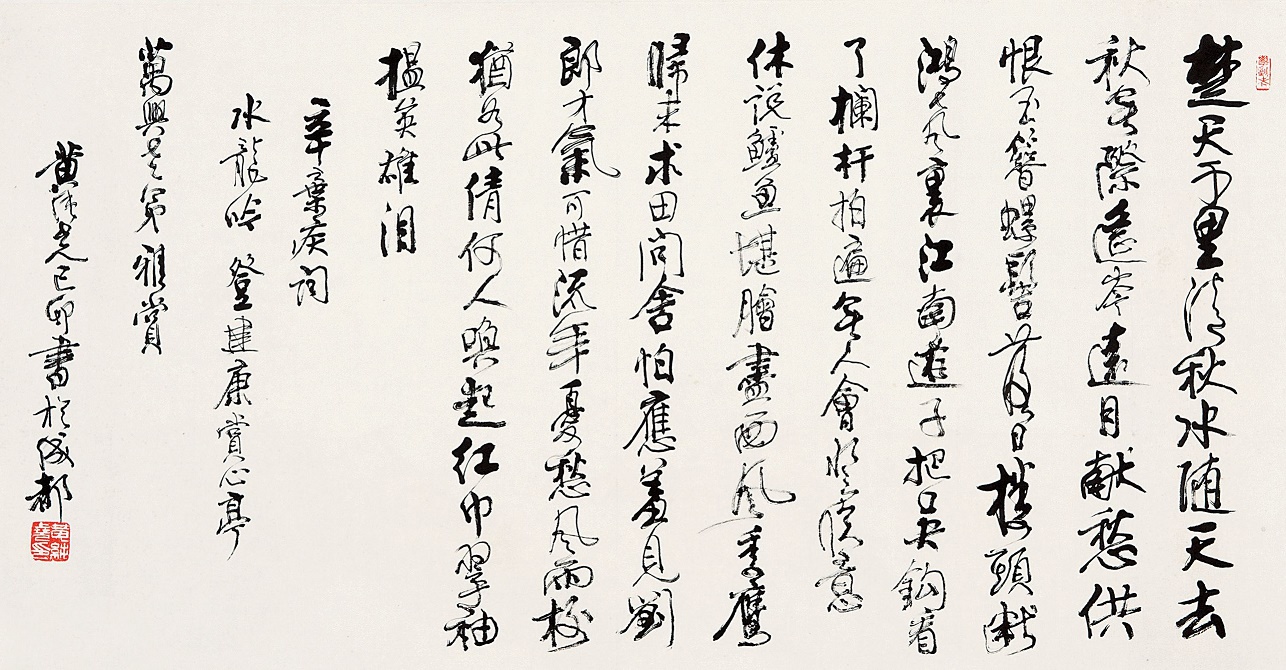 上片大段写景:由水写到山,由无情之景写到有情之景,很有层次。开头两句,“楚天千里清秋,水随天去秋无际”,是作者在赏心亭上所见的景色。楚天千里,辽远空阔,秋色无边无际。大江流向天边,也不知何处是它的尽头。遥远天际,天水交融气象阔大,笔力遒劲。“楚天”的“楚”地,泛指长江中下游一带,这里战国时曾属楚国。“水随天去”的“水”,指浩浩荡荡奔流不息的长江。“千里清秋”和“秋无际”,显出阔达气势同时写出江南秋季的特点。南方常年多雨,只有秋季,天高气爽,才可能极目远望,看见大江向无穷无尽的天边流去的壮观景色。