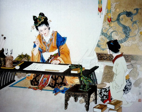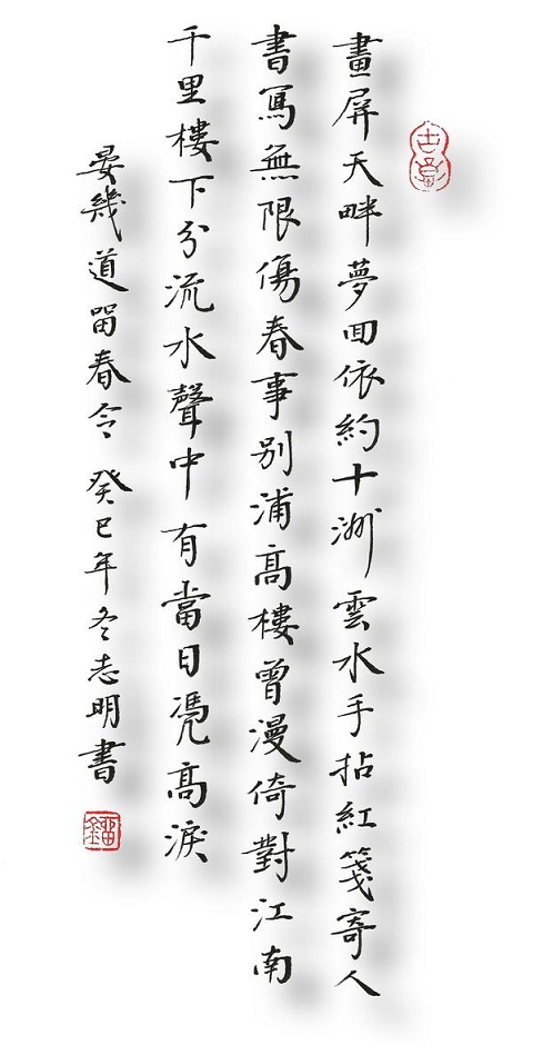 从梦中刚刚醒来,隐约恍惚。画面上面的十洲云水,宛如罩着迷雾,就象在天边。我坐起来展开红色的信笺,给我的心上人写情书。我只有把所有伤心的心情,告诉你。在我们作别的那河边的高楼上,我曾多次去老地方徘徊,面对江南的千里山水,我更加凄楚。楼下分流的水声之中,就有我当日凭栏时流下的思念的相思泪珠,我如何消愁。