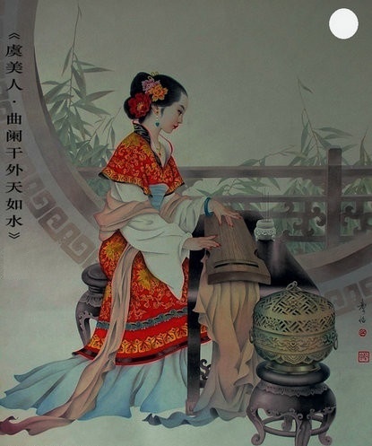 曲阑干外天如水,昨夜还曾倚。出自北宋晏几道词作《虞美人·曲阑干外天如水》,选自《小山词》。此为怀人怨别词。词的上片描述女主人公倚阑望月、盼人归来之情。下片抒写女子不幸被弃之恨,与上片的真诚信托、痴情等待形成强烈的反差。该词中以浅近而真挚的语言,回旋往复地抒写了词人心中短暂的欢乐和无法摆脱的悲哀,寄托了词人在落拓不堪的人生境遇中对于人情冷暖、世态炎凉、身世浮沉的深沉感慨。词中着意刻画的女子形象,隐然蕴含作者自伤幽独之感。