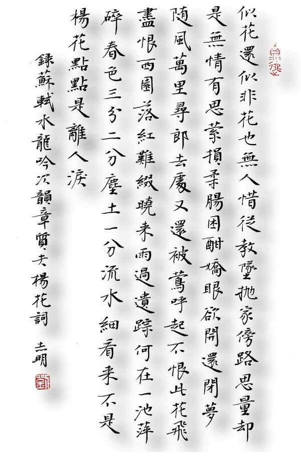 上阕首句“似花还似非花”出手不凡,耐人寻味。它既咏物象,又写人言情,准确地把握住了杨花那“似花非花”的独特“风流标格”:说它“非花”,它却名为“杨花”,与百花同开同落,共同装点春光,送走春色;说它“似花”,它色淡无香,形态细小,隐身枝头,从不为人注目爱怜。