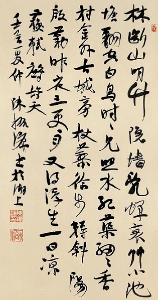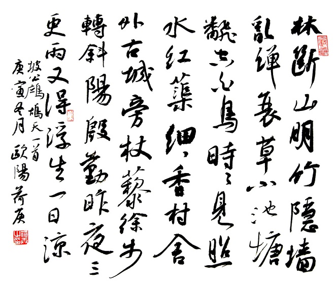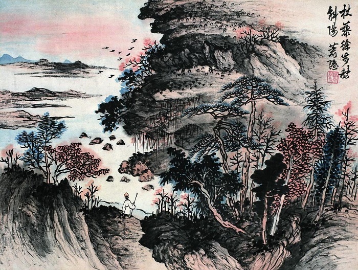 远处郁郁葱葱的树林尽头,有耸立的高山。近处竹林围绕的屋舍边,有长满衰草的小池塘,蝉鸣缭乱。空中不时有白色的小鸟飞过,塘中红色的荷花散发幽香。