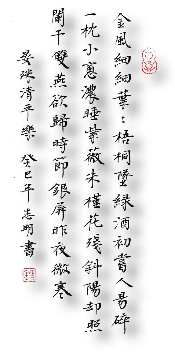 如果说上阕是从昨晚的醉眠写起,那么下阕则是写次日薄暮酒醒时的感觉。词人一醉就睡了整整一个昼夜,睡极浓矣。浓睡中无愁无忧,酒醒后情绪如何,他没有言明,只是通过他眼巾所见的景象,折射出心情之悠闲,神态之慵怠;不过在结句中仍然透露出一丝丝哀愁。过片中的紫薇,植物名,夏季开花;朱槿,夏秋间吐艳。上阕说金风吹得梧桐叶坠,分明是秋季了,所以词人从小窗望出去,此刻这两种花都已凋残。值得注意的是,前阕的梧桐叶坠,为耳中所闻;后阕的两种花残,乃眼中所见。词人正是通过对周围事物的细微体察,来表现此际的情怀。“斜阳却照阑干”,紧承前句,描写静景。晏殊在《踏莎行》词中云:“一场愁梦酒醒时,斜阳却照深深院。”情境皆相似。两处都用了“却”字。却者,正也。此处是说抬头望去,一抹斜阳正照着阑干,颇有陶渊明“悠然见南山”的神韵,然而词人所见者不是南山,而是残花、斜阳,其中似寓有无可奈何的心境。