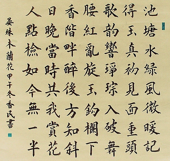 玉钩阑下香阶畔,醉后不知斜日晚。出自宋代文学家晏殊的词作《木兰花·池塘水绿风微暖》。这首词上下两片对照来写,以上阕场面之热烈,反衬下阕之凄情,怀旧之情一览无遗。这首词写作者在池塘旧地回忆往昔初识佳人。开头两句与结尾两句为今日情事,中间四句为忆旧。绿水池塘,微风送暖,牵动词人对往昔的回忆。当时词人与玉真初次相见,歌舞之情难禁,掐指细数当时与之一起在这儿赏花行乐的人,如今旧友零落过半,自己唯借酒消愁。结句由虚入实,感情沉着,情韵杳渺。表现出词人博爱的胸襟,透露出对人生无常的伤感。
