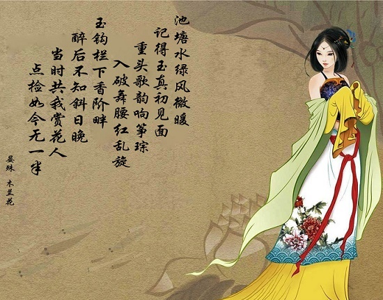 池塘水绿风微暖,记得玉真初见面。重头歌韵响琤琮,入破舞腰红乱旋。