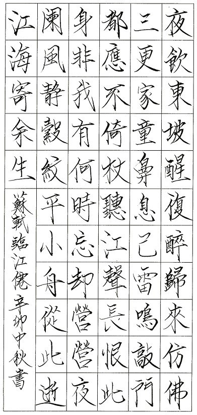 夜饮东坡醒复醉,归来仿佛三更。家童鼻息已雷鸣。敲门都不应,倚杖听江声。