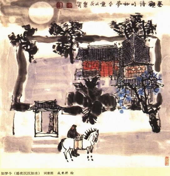 最后一句,写“梦破”直到天明的所感所闻。由于秋寒袭人,加以思绪难平,词人再也睡不着了,两个“无寐”,正是他归梦难成,夜阑无绪,欲眠不能,欲怨无由的心理写照,使人仿佛觉得是词人在万般无奈之时脱口而出的怨语。“门外马嘶人起”,终于,一片人声马嘶,打破了沉沉夜幕,无寐的词人也可以暂时抛开那秋夜的寒意,那紊乱的心绪了。但是,一个白昼之后,不又得回到那沉沉如水的遥夜当中,品味那似乎永远品不完的离愁和凄凉!