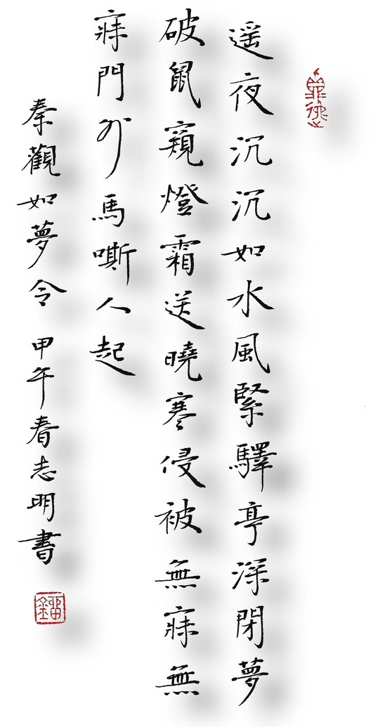 遥夜沉沉如水,风紧驿亭深闭。出自宋代词人秦观的作品《如梦令·遥夜沉沉如水》,是词人在贬谪途中,夜宿寒冷荒僻的驿舍所作。这首词借写夜宿驿舍的况味,诉说旅途的艰辛。具体写的是在漫漫的长夜里,霜风紧吹,饥鼠窥灯,弄得无法安睡。等到天刚破晓,门外驿马长鸣,人声嘈杂,艰苦的长途跋涉又将开始。通过环境的描写和景物的烘托,寓情于景,把旅人的艰辛和谪贬者的失意表达得真切感人。词作短小而精练,也很有生活气息。