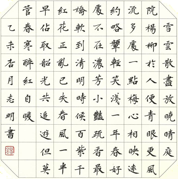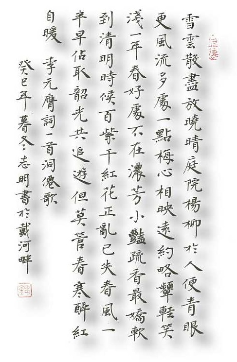 雪后阴云散尽,拂晓时池水花木的庭院已然放晴。杨柳绽放着嫩芽新叶,遇人便露出了喜悦媚眼。更有风流多情,是那一点梅心。远远地与杨柳相映,隐约地露出淡淡的哀愁、微微的笑容。