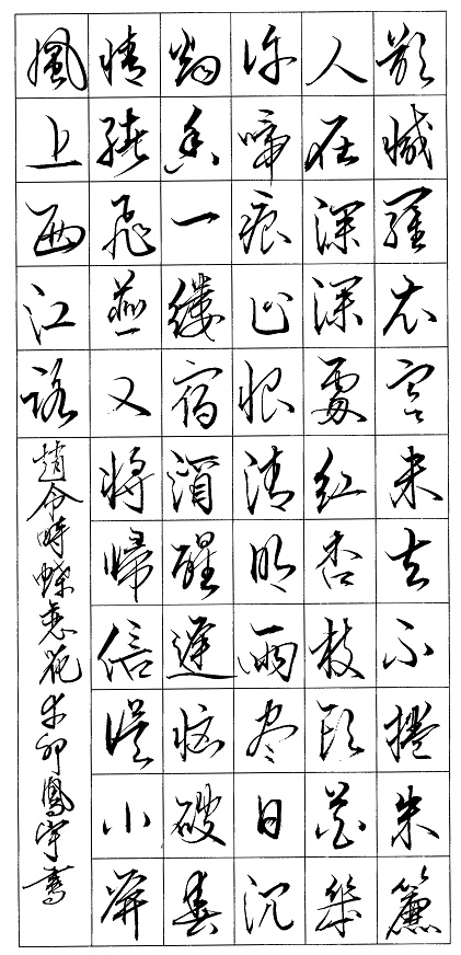 结尾两句“飞燕又将归信误,小屏风上西江路”,让我们知道了女主人公愁思重重的真正原因:原来她是盼望着春燕给她带来远人的信息,而它们却又令人失望。一个“又”字,点明了失望之久。这里不说所惦记着的人没有捎信回来,却怪燕子忘了带信,构思巧妙。于是她只好空对屏风怅望。画屏上烟水茫茫,那条蜿蜒的水路,不正是当初心爱的人远去时所走的西江之路吗?写出了闺中佳人对心上人的一往情深,读之令人感到意犹未尽,一咏三叹。