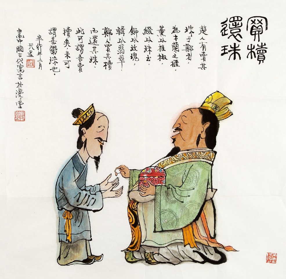 有一个在郑国卖珠宝的楚国人。他用名贵的木兰雕了一只装珠的匣子,将盒子用桂椒调制的香料熏制,用珠宝和宝玉点缀,用美玉连结,用翡翠装饰,用翠鸟的羽毛连缀。有个郑国人把匣子买了去,却把匣子里面的珠子还给了他,这可以说,这个珠宝商人很善于卖盒子,而不善于卖珠宝。