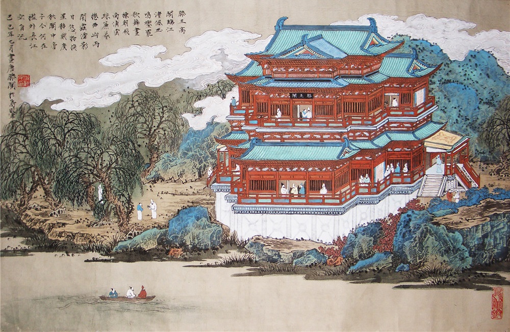 高宗时,洪州都督阎某重修此阁,并于上元二年(675年)的重九日,在滕王阁上欢宴群僚和宾客。作者南下探亲,路过这里,也参加了盛会,即席赋诗,并写了这篇序。