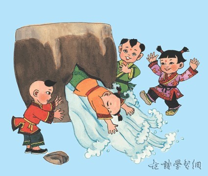 司马光七岁的时候稳重的就像一个大人,听到老师讲解《左氏春秋》,非常喜爱,放学之后又为家人讲他所学到的,他立即也明白了《左氏春秋》的内涵,从此手里放不下书本,甚至到了忘记了饥渴,冷热的程度。有一次,他跟小伙伴们在后院里玩耍,有个小孩爬到大缸上玩,失足掉到缸里的水中。别的孩子们一见出了事,放弃他都跑了,司马光却急中生智,从地上捡起一块大石头,使劲向水缸击去。水涌出来,小孩也得救了。