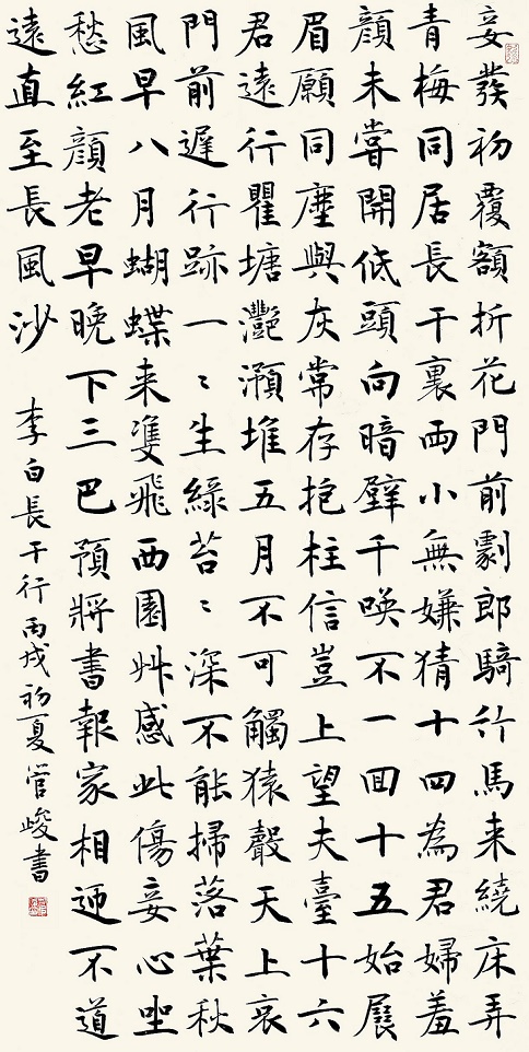 我的头发刚刚盖过额头,便同你一起在门前做折花的游戏。你骑着竹马过来,我们一起绕着井栏,互掷青梅为戏。我们同在长干里居住,两个人从小都没什么猜忌。十四岁时嫁给你作妻子,害羞得没有露出过笑脸。低着头对着墙壁的暗处,一再呼唤也不敢回头。十五岁才舒展眉头,愿意永远和你在一起。常抱着至死不渝的信念,怎么能想到会走上望夫台?十六岁时你离家远行,要去瞿塘峡滟滪堆。五月水涨时,滟滪堆不可相触,两岸猿猴的啼叫声传到天上。门前是你离家时徘徊的足迹,渐渐地长满了绿苔。绿苔太厚,不好清扫,树叶飘落,秋天早早来到。八月里,黄色的蝴碟飞舞,双双飞到西园草地上。看到这种情景我很伤心,因而忧愁容颜衰老。无论什么时候你想下三巴回家,请预先把家书捎给我。迎接你不怕道路遥远,一直走到长风沙。