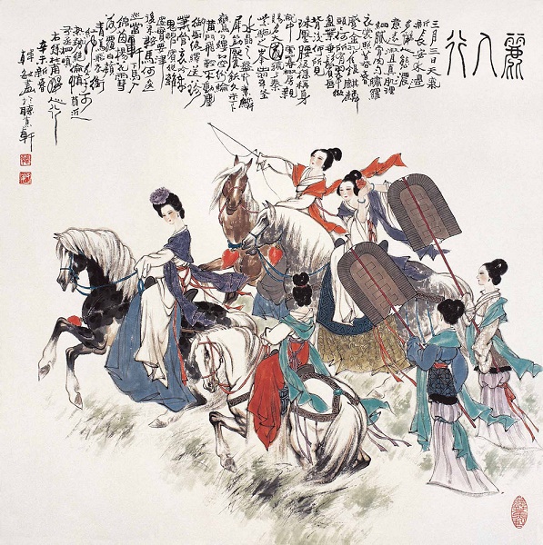 成功的文学作品,它的倾向应当从场面和情节中自然而然地流露出来,不应当特别把它指点出来,作者的见解愈隐蔽,对艺术作品来说就愈好;而且作家不必要把他所描写的社会冲突的历史的未来的解决办法硬塞给读者。《丽人行》就是这样的一篇成功之作。这篇歌行的主题思想和倾向倒并不隐晦难懂,但确乎不是指点出来而是从场面和情节中自然而然地流露出来的。从头到尾,诗人描写那些简短的场面和情节,都采取像《陌上桑》那样一些乐府民歌中所惯常用的正面咏叹方式,态度严肃认真,笔触精工细腻,着色鲜艳富丽、金碧辉煌,丝毫不露油腔滑调,也不作漫画式的刻画。但令人惊叹不置的是,诗人就是在这一本正经的咏叹中,出色地完成了诗歌揭露腐朽、鞭挞邪恶的神圣使命,获得了比一般轻松的讽刺更为强烈的艺术批判力量。诗中首先泛写上巳曲江水边踏青丽人之众多,以及她们意态之娴雅、体态之优美、衣着之华丽。