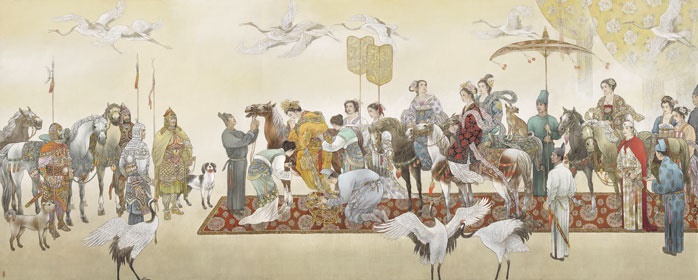 辛延年《羽林郎》:“胡姬年十五,春日独当垆。长裾连理带,广袖合欢襦。头上蓝田玉,耳后大秦珠。两鬟何窈窕,一世良所无。”《陌上桑》:“头上倭堕髻,耳中明月珠。缃绮为下裙,紫绮为上襦。”《焦仲卿妻》:“着我绣夹裙,事事四五通。足下蹑丝履,头上玳瑁光。腰若流纨素,耳着明月珰。指如削葱根,口如含朱丹。纤纤作细步,精妙世无双。”回环反复,咏叹生情,“态浓”八句就是从这种民歌表现手法中变化出来的。前人已看到了这诗用工笔彩绘仕女图画法作讽刺画的这一特色。胡夏客说:“唐宣宗尝语大臣曰:‘玄宗时内府锦袄二,饰以金雀,一自御,一与贵妃;今则卿等家家有之矣。’此诗所云,盖杨氏服拟于宫禁也。”总之,见丽人服饰的豪华,见丽人非等闲之辈。写到热闹处,笔锋一转,点出“就中云幕椒房亲,赐名大国虢与秦”,则虢国、秦国(当然还有韩国)三夫人在众人之内了。着力描绘众丽人,着眼却在三夫人;三夫人见,众丽人见,整个上层贵族骄奢淫佚之颓风见,不讽而讽意见。肴馔讲究色、香、味和器皿的衬托。“紫驼之峰出翠釜,水精之盘行素鳞”,举出一二品名,配以适当颜色,便写出器皿的雅致,肴馔的精美丰盛以及其香、其味来。这么名贵的山珍海味,缕切纷纶而厌饫久未下箸,不须明说,三夫人的骄贵暴殄,已刻画无遗了。“黄门飞鞚不动尘,御厨络绎送八珍”,内廷太监鞚马飞逝而来,却路不动尘,可见其规矩和排场。皇家气派,毕竟不同寻常。写得真好看煞人,也惊恐煞人。如此煞有介事地派遣太监前来,络绎不绝于途,原来是奉旨从御厨房里送来珍馐美馔为诸姨上巳曲江修禊盛筵添菜助兴,头白阿瞒(唐玄宗宫中常自称“阿瞒”)不可谓不体贴入微,不可谓不多情,也不可谓不昏庸了。