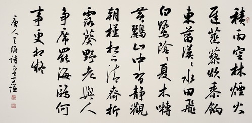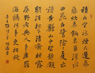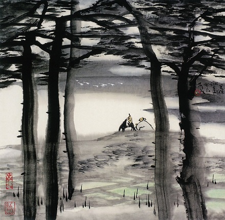 颔联写自然景色,同样是诗人静观所得:“漠漠水田飞白鹭,阴阴夏木啭黄鹂。”辋川之夏,百鸟飞鸣,诗人只选了形态和习性迥然不同的黄鹂、白鹭,联系着它们各自的背景加以描绘:雪白的白鹭,金黄的黄鹂,在视觉上自有色彩浓淡的差异;白鹭飞行,黄鹂鸣啭,一则取动态,一则取声音;漠漠,形容水田广布,视野苍茫;阴阴,描状夏木茂密,境界幽深。两种景象互相映衬,互相配合,把积雨天气的辋川山野写得画意盎然。所谓“诗中有画”,这便是很好的例证。