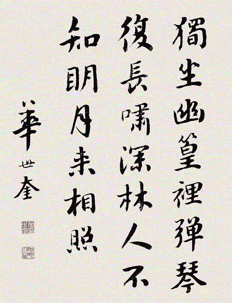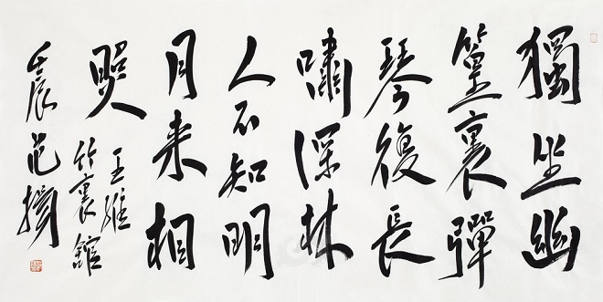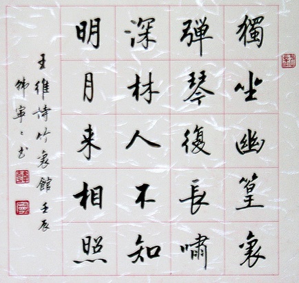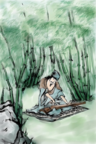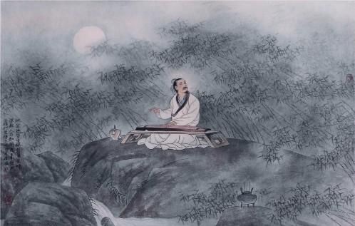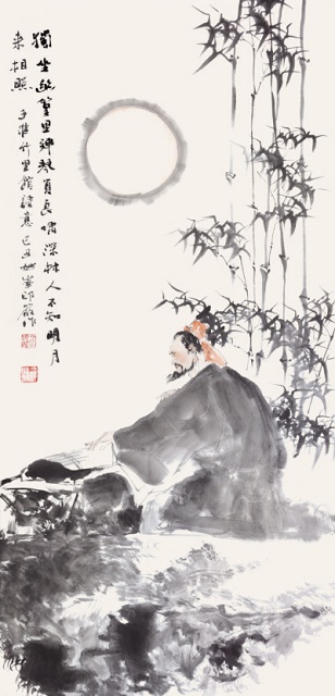 这首诗表现了一种清静安详的境界。前两句写诗人独自一人坐在幽深茂密的竹林之中,一边弹着琴弦,一边又发出长长的啸声。其实,不论“弹琴”还是“长啸”,都体现出诗人高雅闲淡、超拔脱俗的气质,而这却是不容易引起别人共鸣的。所以后两句说:“深林人不知,明月来相照。”意思是说,自己僻居深林之中,也并不为此感到孤独,因为那一轮皎洁的月亮还在时时照耀自己。这里使用了拟人化的手法,把倾洒着银辉的一轮明月当成心心相印的知己朋友,显示出诗人新颖而独到的想象力。全诗的格调幽静闲远,仿佛诗人的心境与自然的景致全部融为一体了。