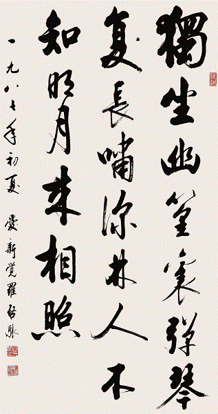 可以想见,诗的意境的形成,全赖人物心性和所写景物的内在素质相一致,而不必借助于外在的色相。因此,诗人在我与物会、情与景合之际,就可以如司空图《诗品·自然篇》中所说,“俯拾即是,不取诸邻,俱道适往,著手成春”,进入“薄言情悟,悠悠天钧”的艺术天地。当然,这里说“俯拾即是”,并不是说诗人在取材上就一无选择,信手拈来;这里说“著手成春”,也不是说诗人在握管时就一无安排,信笔所之。诗中描写周围景色,选择了竹林与明月,是取其与所要显示的那一清幽澄净的环境原本一致;诗中抒写自我情怀,选择了弹琴与长啸,则取其与所要表现的那一清幽澄净的心境互为表里。这既是即景即事,而其所以写此景,写此事,自有其酝酿成熟的诗思。更从全诗的组合看,诗人在写月夜幽林的同时,又写了弹琴、长啸,则是以声响托出静境。至于诗的末句写到月来照,不仅与上句的“人不知”有对照之妙,也起了点破暗夜的作用。这些音响与寂静以及光影明暗的衬映,在安排上既是妙手天成,又是有匠心运用其间的。