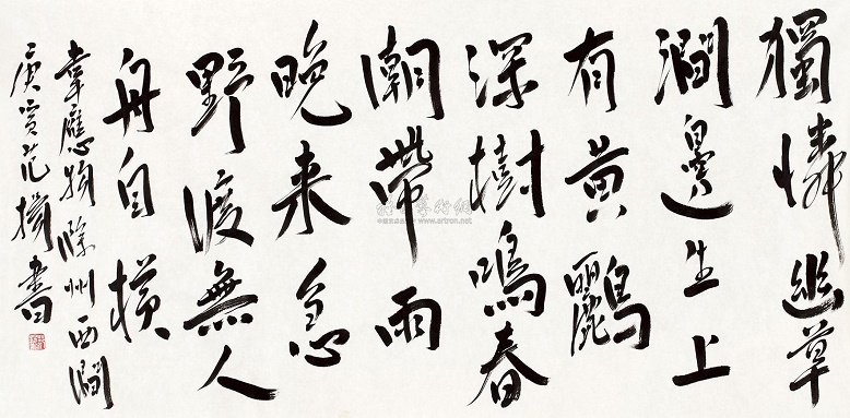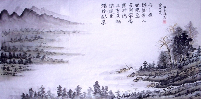 接下来两句侧重写荒津野渡之景。景物虽异,但仍然循此情愫作展衍:“春潮带雨晚来急,野渡无人舟自横”。这两句是说:到傍晚时分,春潮上涨,春雨淅沥,西涧水势顿见湍急。郊野渡口,本来就荒凉冷漠,此刻愈发难觅人踪。只有空舟随波纵横。“春潮”与“雨”之间用“带”字,好像雨是随着潮水而来,把本不相属的两种事物紧紧连在了一起,而且用一“急”字写出了潮和雨的动态。结尾句。用“无人”一说明渡口的‘“野”。二句诗所描绘的情境,未免有些荒凉,但用一“自”字,却体现着悠闲和自得。韦应物为诗好用“自”字,“自”字皆可释为“自在”“自然”之意,含有“自我欣赏”、“自我怜爱”的意蕴。“野渡”句当作如是解。舍此,便与一二句相悖谬了。这两句以飞转流动之势,衬托闲淡宁静之景,可谓诗中有画,景中寓情。