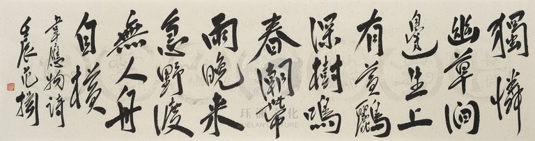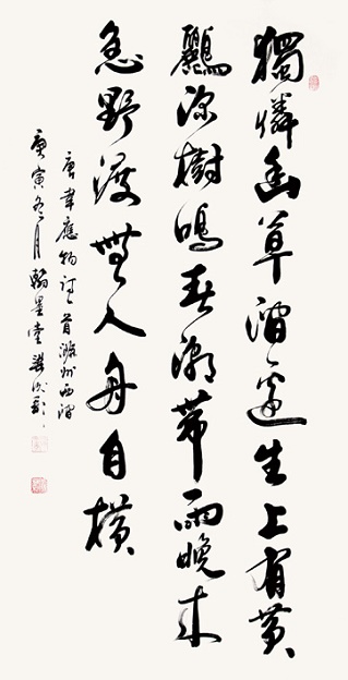 诗写暮春景物。“独怜幽草涧边生,上有黄鹂深树鸣”。是说:诗人独喜爱涧边生长的幽草,上有黄莺在树阴深处啼鸣。这是清丽的色彩与动听的音乐交织成的幽雅景致。暮春之际,群芳已过,诗人闲行至涧,但见一片青草萋萋。这里幽草,深树,透出境界的幽冷,虽然不及百花妩媚娇艳,但它们那青翠欲滴的身姿,那自甘寂寞、不肯趋时悦人的风标,与作者好静的性格相契,自然而然地赢得了诗人的喜爱。这里,“独怜”二字,感情色彩至为浓郁,是诗人别有会心的感受。它表露了作者闲适恬淡的心境。王安石有“绿阴幽草胜花时”之句,写初夏之景,与此同一立意。首句,写静;次句,则写动。莺啼婉啭,在树丛深处间关滑动。莺啼似乎打破了刚才的沉寂和悠闲,其实在诗人静谥的心田荡起更深一层涟漪。次句前头着一“上”字,不仅仅是写客观景物的时空转移,重要的是写出了诗人随缘自适、怡然自得的开朗和豁达。