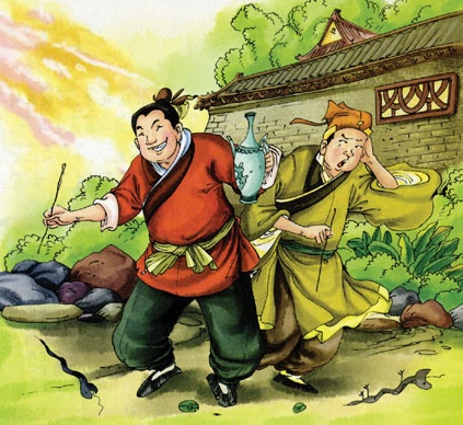 大家都安静下来,这时有人建议:每个人在地上画一条蛇,谁画得快又画得好,就把这壶酒归他喝。大家都认为这个方法好,都同意这样做。于是,在地上画起蛇来。