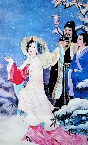 谢太傅在一个 冬雪纷飞的日子里,把子侄们辈的人聚集在一起,跟他们一起谈论诗文。不一会儿,雪下得大了,太傅十分高兴地说:“这纷纷扬扬的白雪像什么?”他哥哥的长子谢朗说:“跟在空中撒盐差不多可以相比。”他另一个哥哥的女儿说:“不如比作柳絮凭借风而起。”谢太傅听了开心的大笑起来。她(谢道韫)就是谢太傅大哥谢无奕的女儿,左将军王凝之的妻子。