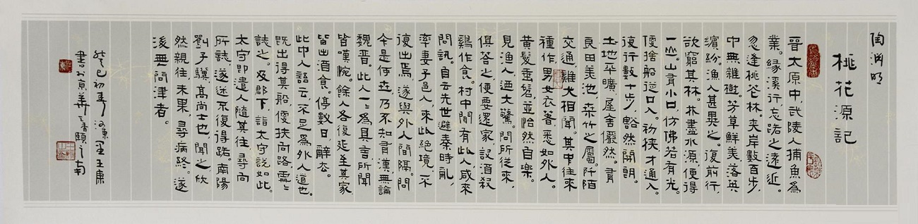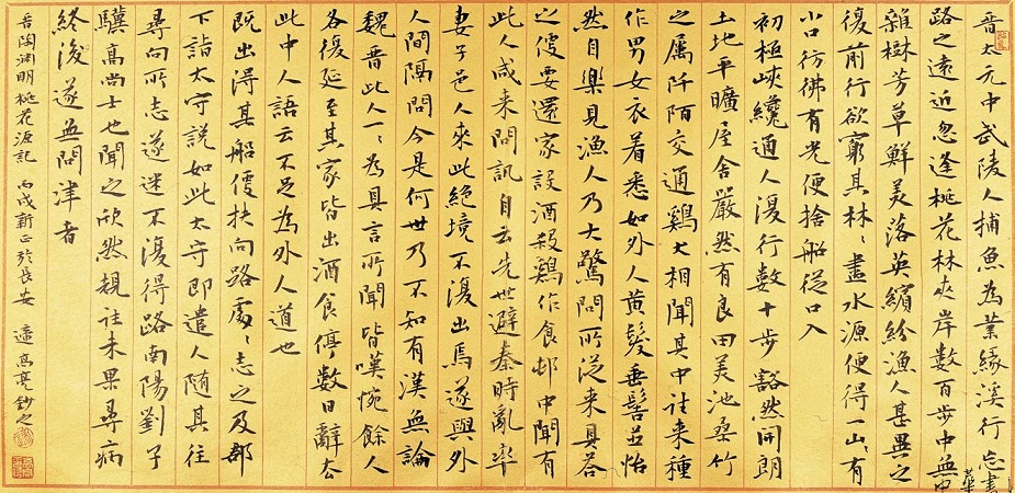 作品简介《桃花源记》是东晋文人陶渊明的代表作之一,是《桃花源诗》的序言,选自《陶渊明集》。于永初二年(421年)作,文章描绘了一个没有阶级,没有剥削,自给自足,人人自得其乐的社会,是当时黑暗社会的鲜明对照,是作者与世人所向往的一种理想社会,它体现了人们的追求与想往,也反映出人们对现实的不满与反抗。
