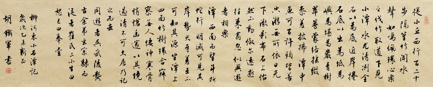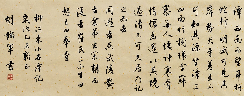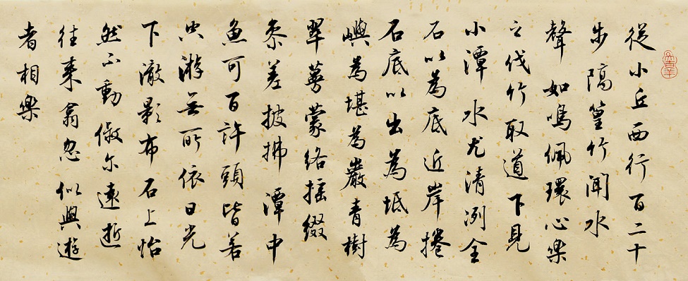 柳宗元的《小石潭记》是一篇文质精美、情景交融的山水游记。全文193字,用移步换景、特写、变焦等手法,有形、有声、有色地刻画出小石潭的动态美,写出了小石潭环境景物的幽美和静穆,抒发了作者贬官失意后的孤凄之情。