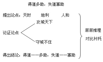 中心论点即篇首两句。孟子提出三个概念:天时、地利、人和,并将这三者加以比较,层层推进。