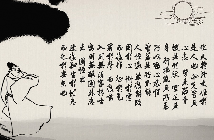 故天将降大任于斯人也,必先苦其心志,劳其筋骨,饿其体肤,空乏其身,行拂乱其所为,所以动心忍性,曾益其所不能。(斯人 一作:是人)