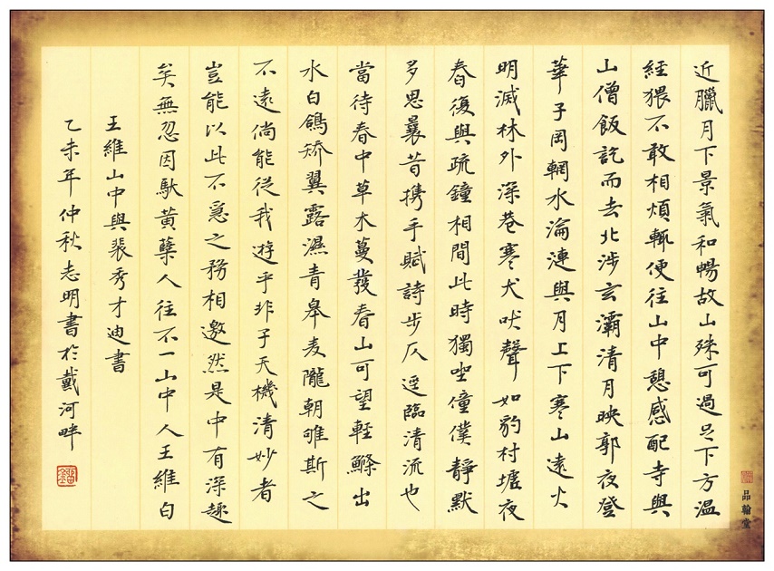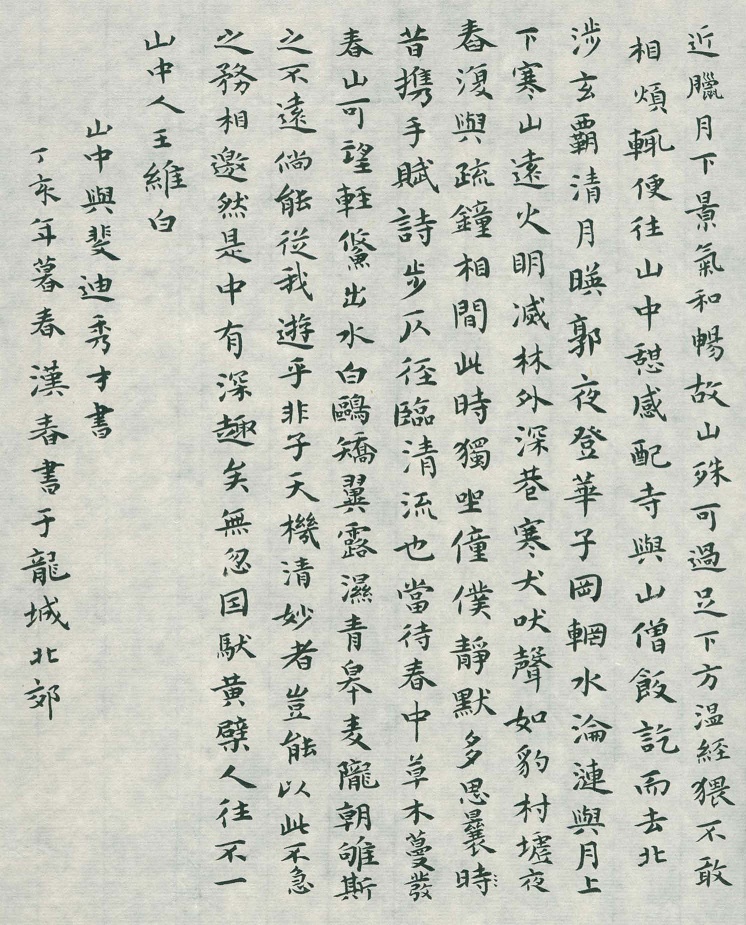 当待春中,草木蔓发,春山可望,轻鲦出水,白鸥矫翼,露湿青皋,麦陇朝雊,斯之不远,倘能从我游乎?非子天机清妙者,岂能以此不急之务相邀。然是中有深趣矣!无忽。因驮黄檗人往,不一,山中人王维白。